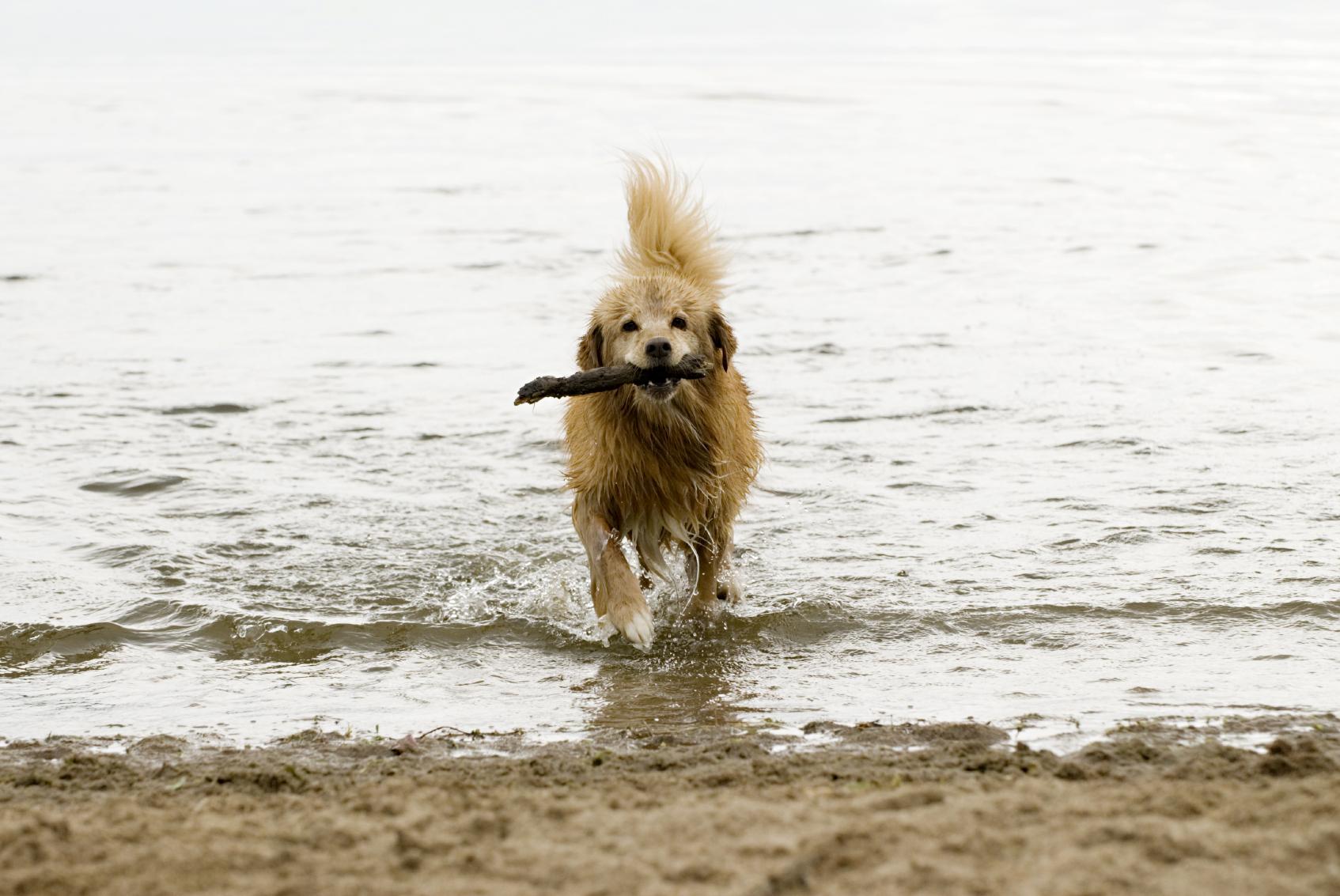 - Adoran el agua. Aunque puede existir algún golden retriever que sienta animadversión por el agua al no conocerla, lo cierto es que la mayoría disfrutan sin límites de un chapuzón en la playa, el río o alguna fuente de la ciudad. Llévalo contigo a uno de estos lugares y observa cómo disfruta.