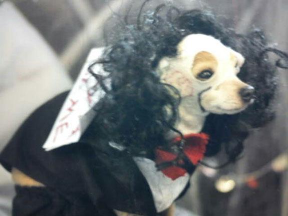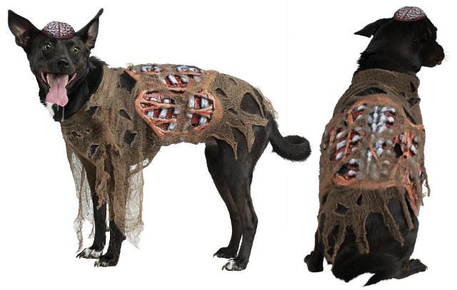De entre todos los disfraces para perros pequeños, este es el que puede hacerse de distintos modos y solo necesitas tu imaginación, por lo que es muy fácil de llevar a cabo. Puedes intentar imitar el que observas en la fotografía con distintas telas y dibujando las vísceras pero también puedes hacerte con tiza de color rojo y aplicarla sobre el pelo húmedo de tu perro, creando así un efecto sangriento. Busca la originalidad entre falsos órganos y falsa sangre para que tu perro sea el más zombie de la noche.