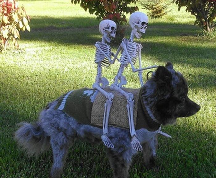 Si tu perro odia que le disfraces pero está acostumbrado a llevar arnés, puedes probar este curioso disfraz de jinete de los muertos. Solo necesitarás elaborar o cubrir tu propio arnés con telas e incluir uno o dos esqueletos humanos en miniatura. La imagen es espeluznante... ¡y muy divertida!