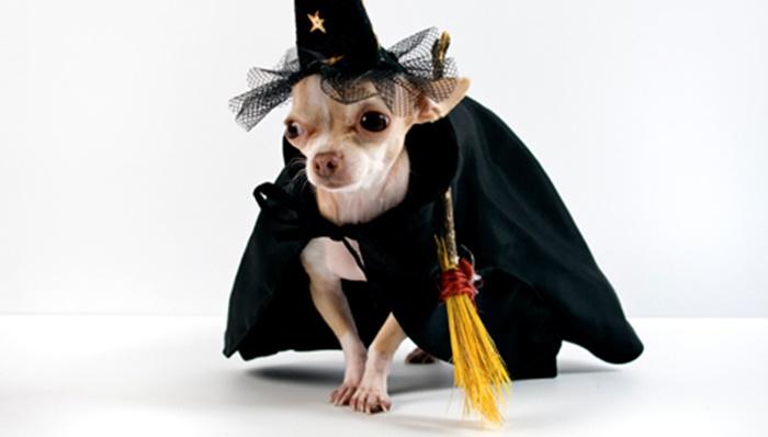 Sin duda el disfraz de bruja para perros es de los más populares en Halloween y otro muy fácil de lograr. Necesitarás hacerte con un sombrero que fijarás con una goma elástica, una tela en forma de túnica y, para mejorar la calidad del disfraz, puedes improvisar una pequeña escoba. ¡Perfecto!