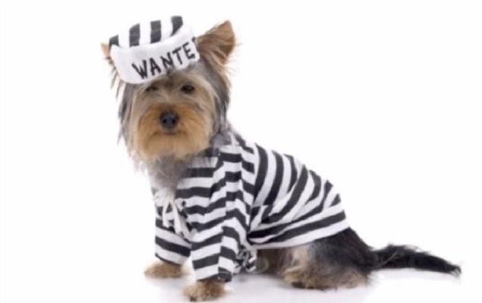 Para tener a tu lado un auténtico perro carcelario necesitarás comprar una camiseta para niños (en algún comercio económico) de rayas. Para este disfraz casero para perro pequeño también necesitarás elaborar un gorro, como el de la imagen, y fijarlo con una goma elástica para impedir que se mueva. Para rematar, puedes buscar una bola de peluche que simule los grilletes y coserla en el pecho.