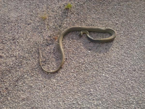 El otro día paseando por una via de servicio, al lado de la autovía Madrid-Valencia a la altura de Montalbo, me encontré este ofidio, no he podido identificarlo en ninguna web. Lamentablemente estaba muerta, quizás atropellada por una bicicleta pues no se apreciaban muchos daños. Mediría aproximadamente unos 80 centímetros. ¿De qué reptil podemos estar hablando? Lamento la calidad de la imagen, mi teléfono no es de última generación.