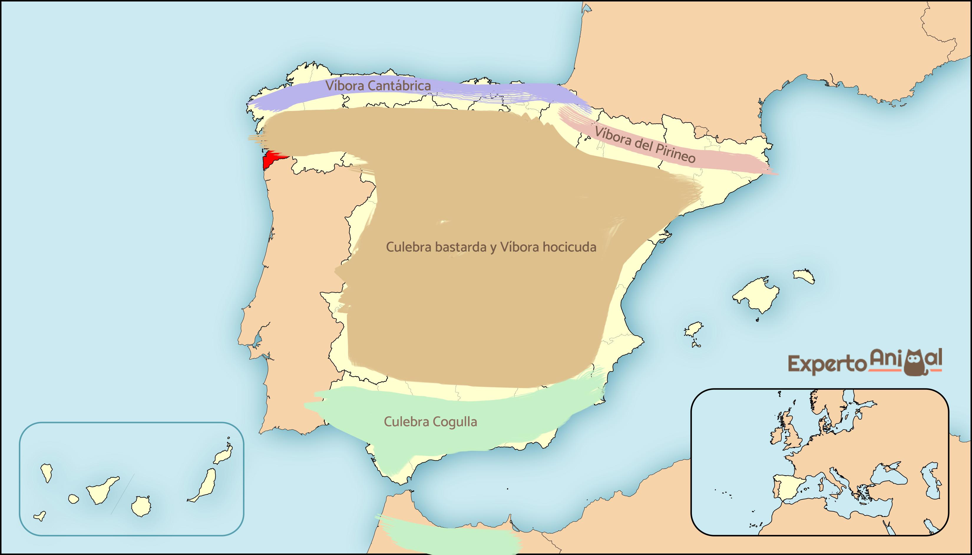 A continuación te mostramos cómo es la distribución aproximada de estas cinco serpientes en España: