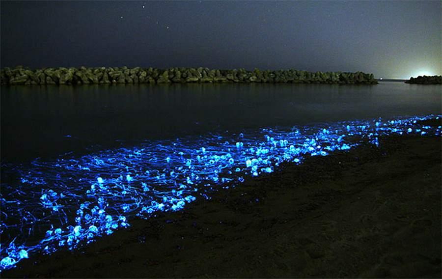 Y hablando de los animales marinos tenemos al calamar luciérnaga. Cada año, en la costa de Japón, específicamente en la Bahía de Toyama durante los meses de marzo a mayo, que es su temporada de apareamiento, se observan a los calamares luciérnaga y su fascinante espectáculo natural de la bioluminiscencia, que se produce cuando la luz de la luna realiza una reacción química con sus membranas externas.