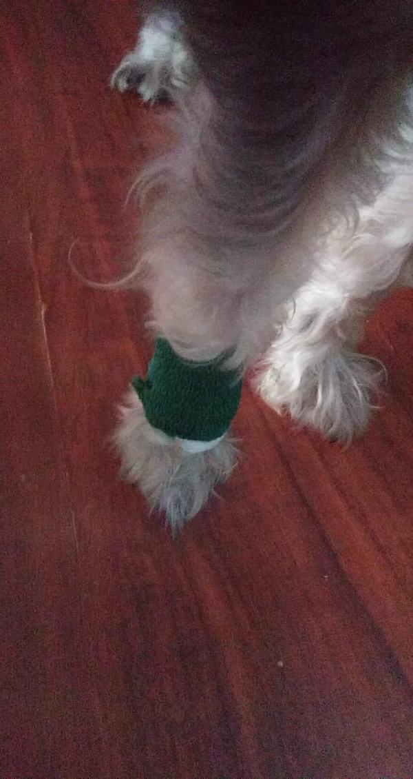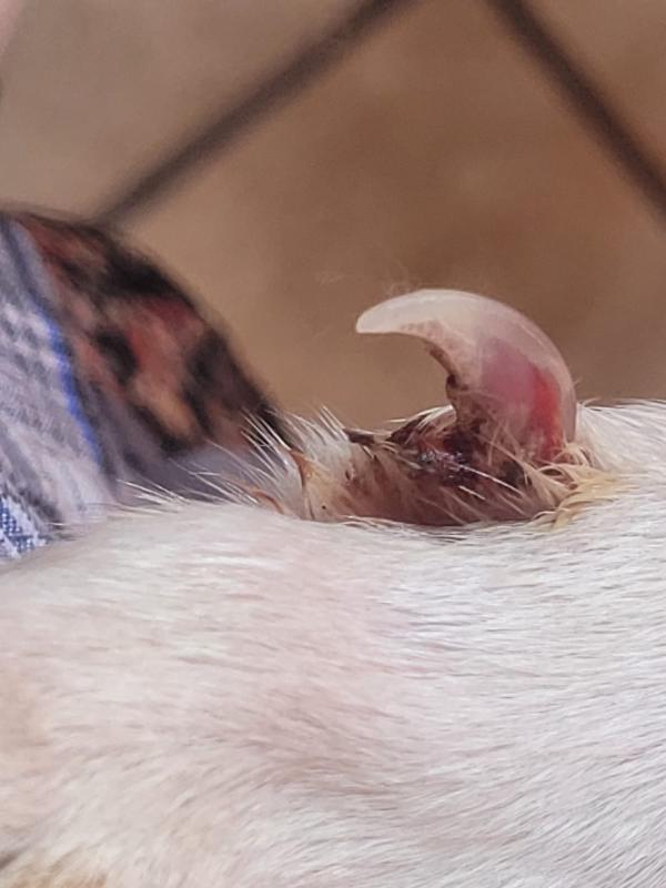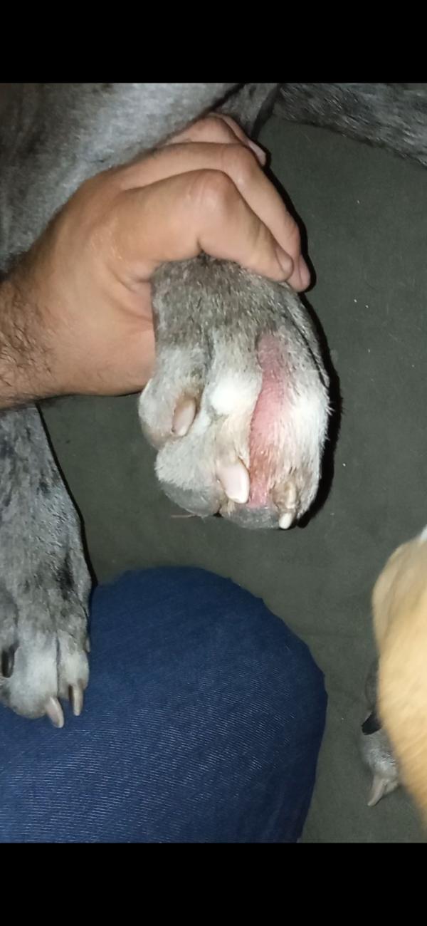 Saludos, tengo un dogo argentino adulto de unos 6 años de edad, tiene una uña partida en la pata delantera izquierda en el espolon y se lame mucho tambiente tiene hinchado al rededor de esa uña, adjunto las fotos para que me sugieren que puedo hacer para que se le cure lo mas rapido posible. Gracias.