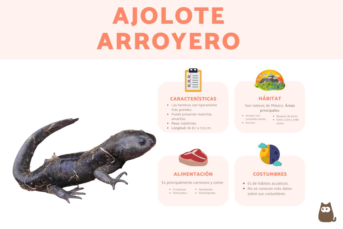 Los ajolotes o salamandras topo, son un grupo de anfibios, que tienen un aspecto similar a una lagartija, aunque no están relacionadas con estas. Estos curiosos animales son nativos de Norteamérica, y forman parte importante de la cultura mexicana, aunque varias especies están en peligro. Taxonómicamente pertenecen al orden Caudata, familia Ambystomatidae y al género Ambystoma. Aunque no son abundantes los datos científicos sobre algunas de las especies, como es el caso del ajolote arroyero (Ambystoma rivulare), en esta ficha de ExpertoAnimal te presentamos algunas de las generalidades de este anfibio. Te invitamos a que continúes leyendo.