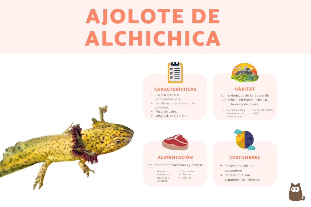 ¿Dónde vive el ajolote de Alchichica? Es una especie de ajolote endémica de la laguna de Alchichica, que corresponde con un cuerpo de agua formado en un cráter salobre ubicado al este de Puebla, México, a unos 2.290 msnm. El ajolote de Alchichica no ha sido ubicado fuera de esta área, la cual abarca 2,4 km2. El hábitat no solo es salino, también es alcalino, y con temperaturas que están entre 18 a 21o C.
