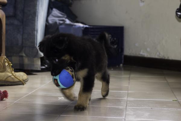 Será conveniente que a partir de los 6 meses le demos a nuestro cachorro de pastor alemán, huesos inastillables como el de rodilla de ternera, para que roa y se le fortalezcan dientes y encías.