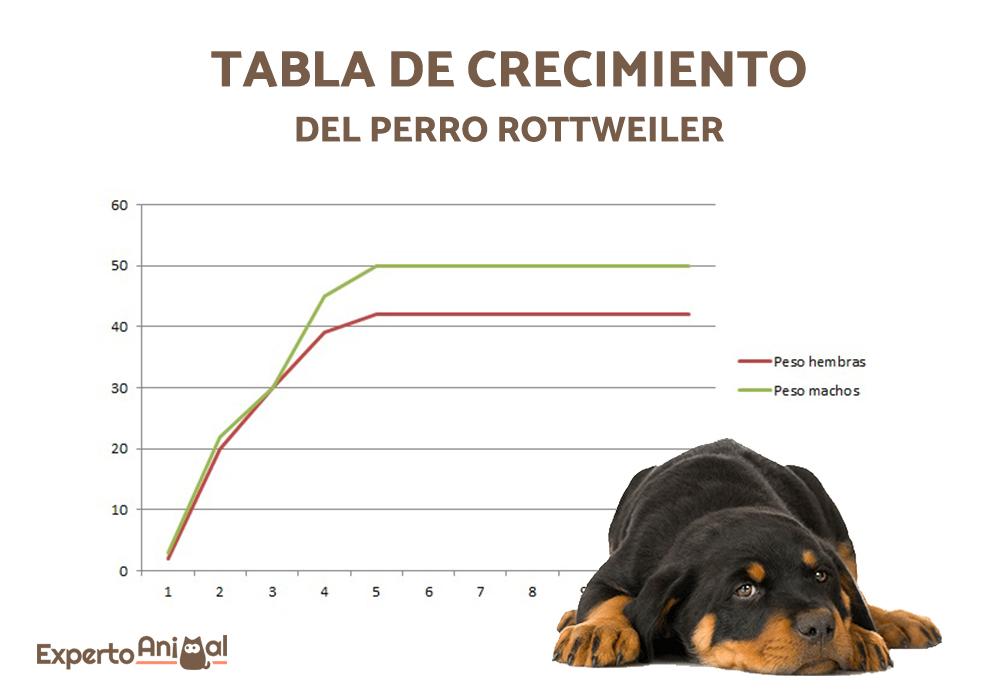 No obstante, recuerda siempre que la prevención es la clave para prevenir la obesidad en el rottweiler y conservar su buena salud. A continuación, te ofrecemos un gráfico del crecimiento, desarrollo y gano de peso de los perros machos y hembras pertenecientes a la raza rottweiler: