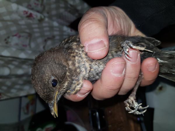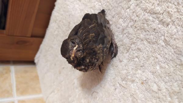 Hola, vivo en una casa con un jardín comunitario con muchos árboles habitados por muchos tipos de pájaros. Hoy me he encontrado bajando al perro un pollito que parece ser un mirlo, pero no sé muy bien cómo identificar su edad. Desde luego, solo no come porque le he acercado una hormiga y no ha hecho nada. Parece que tiene plumón y la cola cortita así que supongo que muy mayor no será. Lo he dejado en una caja de zapatos con un trapo y sin tapar, pero no sé si es el sitio más adecuado. Me vendría bien un poco de ayuda, estoy un poco nerviosa y me gustaría que sobreviviese. Voy a dejar una foto por si me estoy equivocando y no es un mirlo.