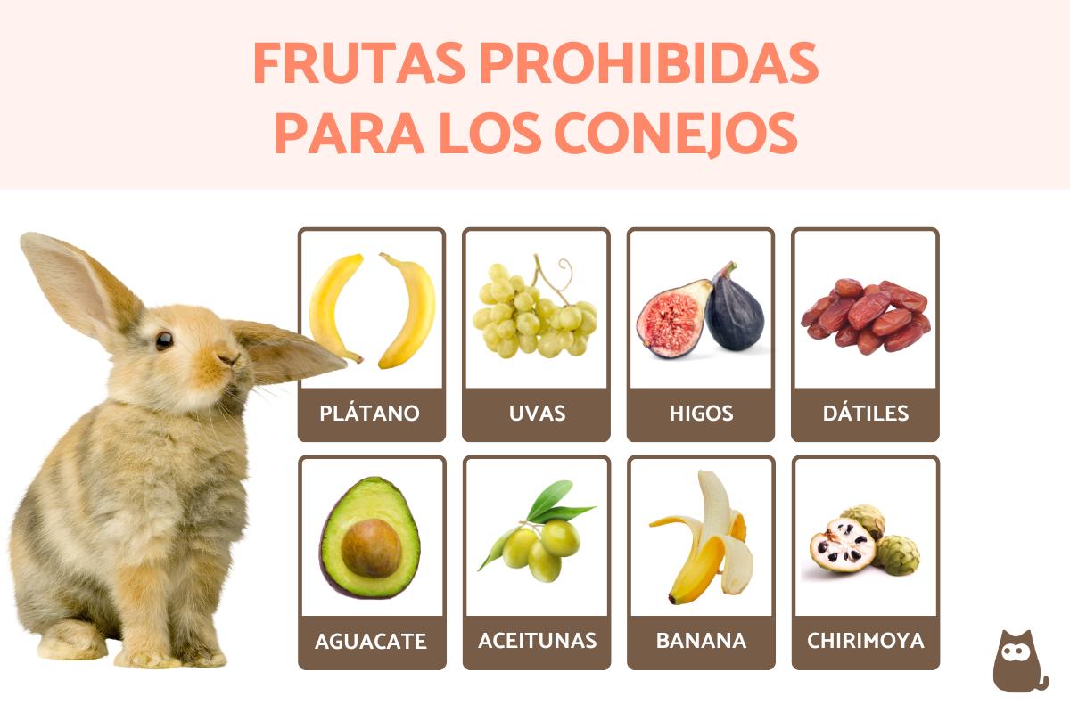 Las frutas son, en general, un alimento de origen vegetal que debe suministrarse con cautela a los conejos. A pesar de ser alimentos permitidos o aptos para su consumo, su alto contenido en azúcares no las hace recomendables como alimento usual. Existen frutas, como el melón, las frambuesas, la manzana o la pera, que se pueden aportar de forma ocasional, una o dos veces por semana. Sin embargo, existen una serie de frutas prohibidas para los conejos que no se deben aportar bajo ningún concepto. Las mencionamos a continuación: