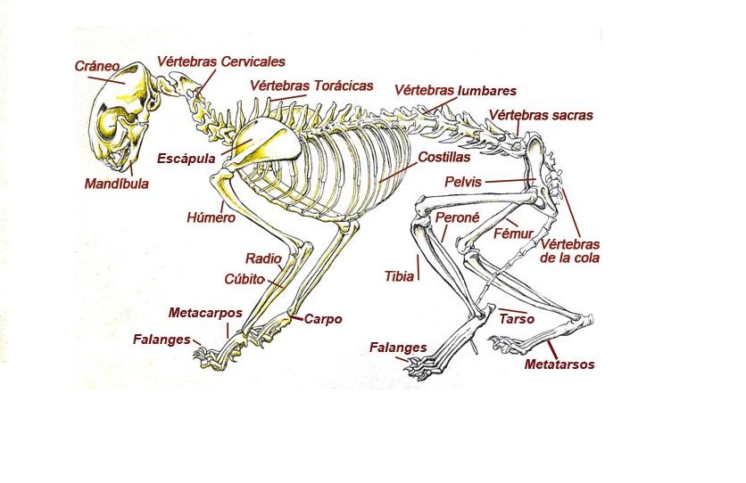 En cuanto a la anatomía del gato relativa a los huesos, destaca un cráneo donde solo la mandíbula inferior es móvil. La espina dorsal se compone, de arriba hacia abajo, de siete vértebras cervicales, trece torácicas, siete lumbares, tres sacras y unas veinte vértebras caudales. Los discos intervertebrales son los que otorgan la flexibilidad tan celebrada del esqueleto felino. A las vértebras torácicas se unen trece pares de costillas. Si nos preguntamos cuántos huesos tiene un gato debemos saber que no hay un número fijo. Se da una cifra media de 244.