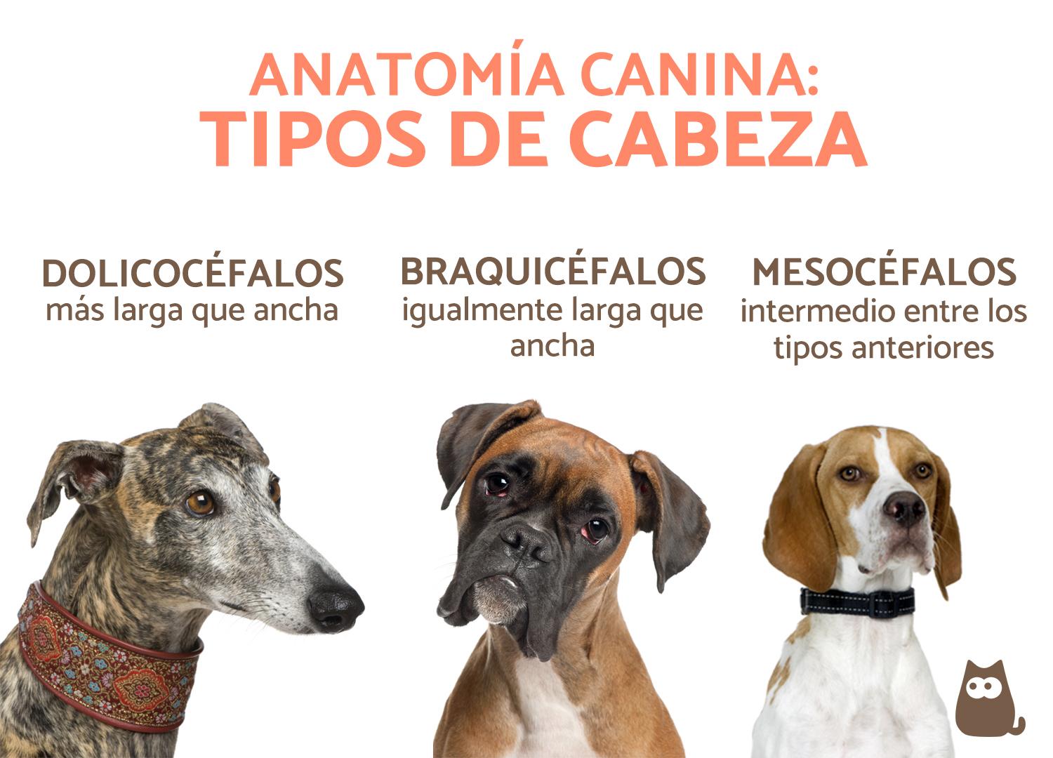 La anatomía del perro es muy amplia debido a la diversidad de razas que existen. Las distintas razas de perros no solo difieren entre sí por el tamaño, sino por la forma de muchas partes del cuerpo. Una de ellas, quizá la más significativa, es la cabeza. Principalmente, encontramos tres tipos diferentes de cabeza: