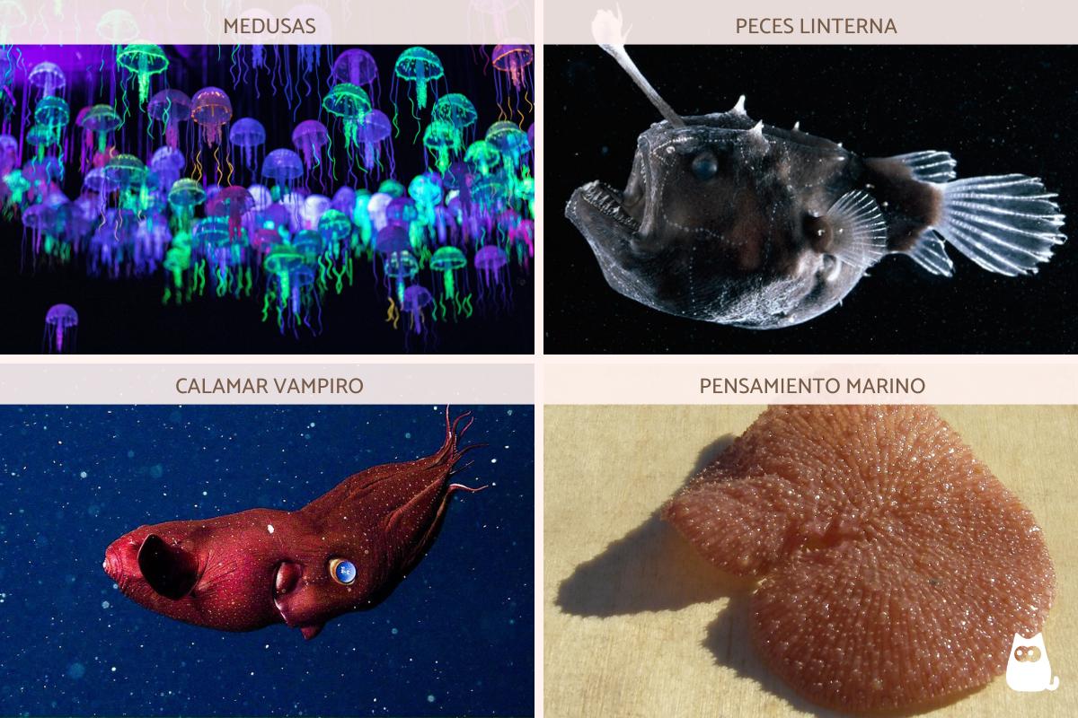 Algunos de los ejemplos más fascinantes de animales bioluminiscentes marinos son: