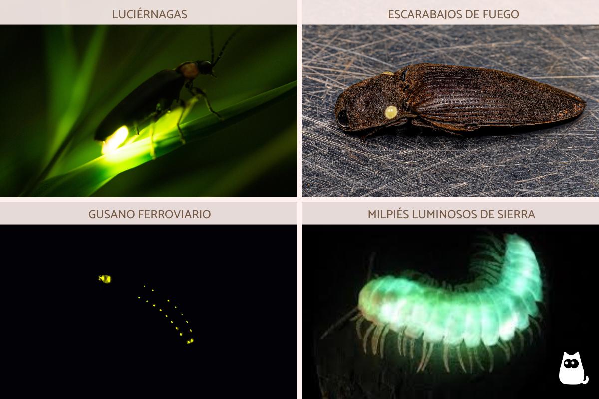 - Escarabajos click o de fuego: pertenecientes al género Pyrophorus, son insectos comunes en América Latina. Presentan órganos luminosos en el tórax y el abdomen, y se cree que esta luz les sirve para ahuyentar depredadores o para comunicarse con otros individuos de su especie.
