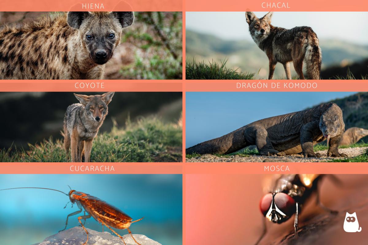Ahora que conocemos la función de estos animales en el ciclo de la vida, ¿cómo se definen? ¿Qué son los animales carroñeros? Los carroñeros son animales que han evolucionado para depender de organismos ya muertos en lugar de cazar su propio alimento. La mayoría de estos animales son carnívoros y algunos omnívoros, que se alimentan de material vegetal podrido o incluso papel. En ocasiones, los carroñeros pueden cazar su propio alimento, pero esto sólo ocurre ante el hambre extrema cuando la presa está casi muerta.