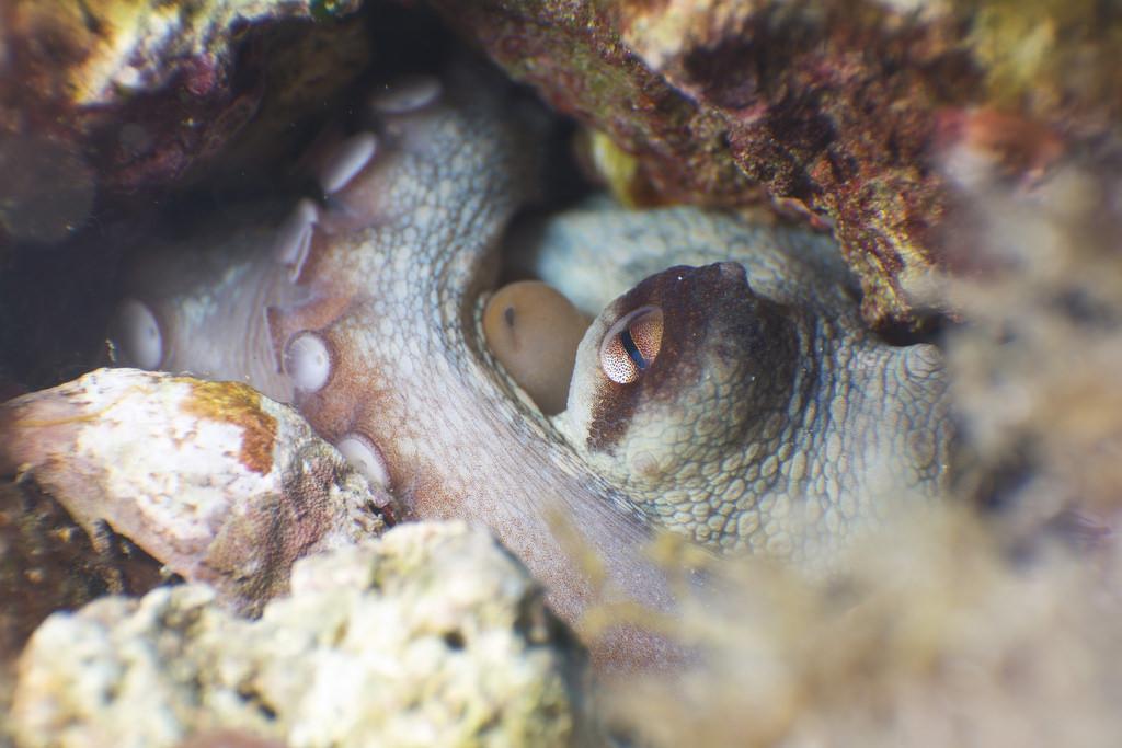 El pulpo común (Octopus vulgaris) es un molusco que vive en el mar Mediterráneo y el océano Atlántico oriental. Destaca por ser uno de los animales con ojos grandes más inteligentes del mundo. Su piel es castaña, tiene la cabeza ovalada y posee 8 brazos con hileras ventosas. Es un animal nocturno que vive a 100 metros de profundidad y se alimenta de crustáceos y peces. Entre los ojos de animales, los del pulpo presentan una pupila rectangular que le proporciona un rango de visión amplio. Además, son capaces de regular la cantidad de luz que entre en ellos, pero aun así son miopes.