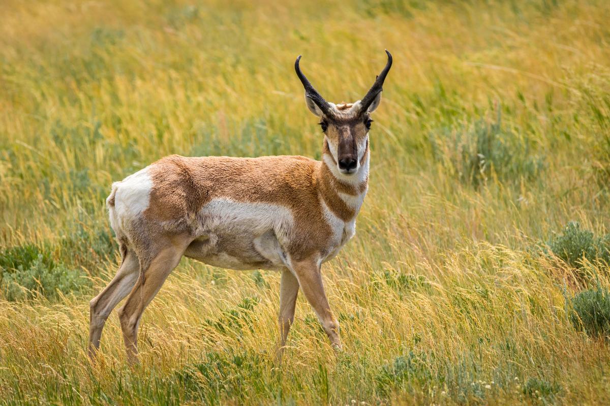 El berrendo o antílope americano es un mamífero nativo de América del Norte y es conocido por ser el animal terrestre más rápido del continente, alcanzando velocidades de hasta 90 km/h. Mide entre 85 y 100 cm de altura y pesa entre 40 y 65 kg. Su pelaje es marrón claro con manchas blancas en el vientre, garganta y rabadilla, y los machos presentan cuernos curvos que pueden llegar a medir 30 cm.