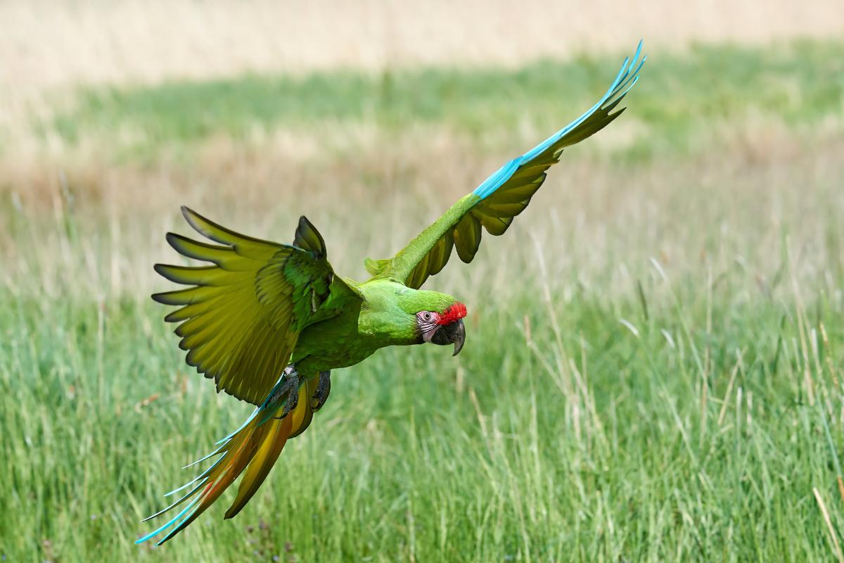 El guacamayo verde, también conocido como guacamayo militar, es una especie de loro de gran tamaño y de colores brillantes nativo de América Central y el noroeste de América del Sur. En Chihuahua, se puede encontrar en áreas boscosas y semiáridas, donde el entorno le proporciona alimento y refugio. También está presente en otras zonas como el estado de Sinaloa, como vemos aquí: "Animales de Sinaloa". Mide entre 70 y 85 cm de largo y presenta un plumaje verde predominante, con toques de rojo en la frente y azul en las alas y la cola.