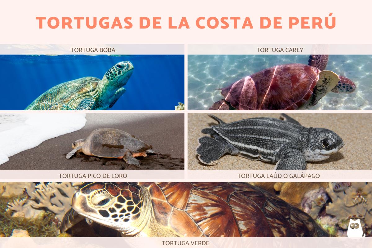 Las tortugas también tienen presencia en las zonas marítimas y costeras de Perú, destacándose principalmente cinco especies, las cuales son las siguientes.
