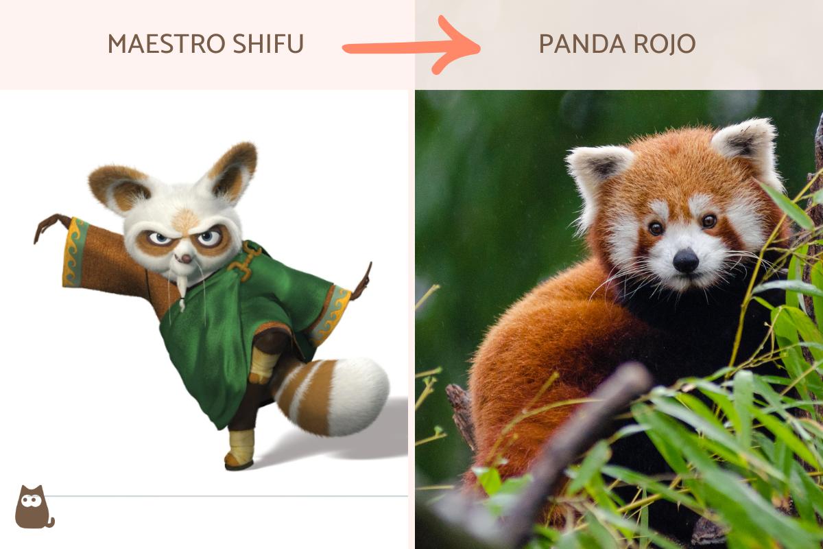 Siguiendo con los animales de "Kun Fu Panda" nos encontramos con el maestro Shifu. El maestro Shifu es un importante personaje, y corresponde en la vida real con el panda rojo (Ailurus fulgens). Aunque su color de pelaje puede generar confusión, hay que tener en cuenta que su personaje es un anciano. Este maestro es quien dirige el Palacio de Jade y es el entrenador, en principio, de los cinco furiosos y luego de Po, a quien reconoce como el Guerrero Dragón.