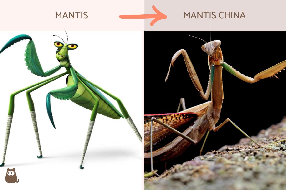 Este animal de "Kung Fu Panda" representa a una mantis china (Tenodera sinensis), un tipo de mantis que es nativa de Asia, pero que fue introducida en otros países. Es una de las especies más grandes, midiendo en promedio 7 cm, pero las hembras pueden llegar a unos 12 cm, con una masa de unos 3 gramos. Tienen un color tostado combinado con verde. No obstante, hay otras especies bastante similares.