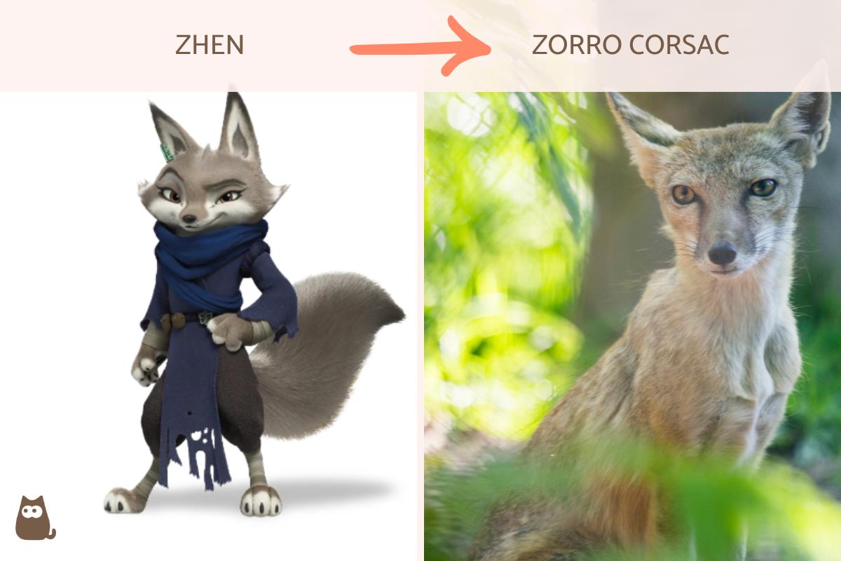 Zhen es una ladrona que aparece en "Kung Fu Panda 4", y aunque inicialmente Po la atrapa, luego lo acompaña en una misión. Este personaje representa a una hembra de la especie conocida como zorro corsac (Vulpes corsac), un tipo de zorro nativo de China y otras regiones de Asia. Estos zorros miden hasta unos 65 cm con una cola de hasta 35 cm, pesan entre 1,6 y 3,2 kg, y tienen el pelaje gris amarillento con blanco. La especie está clasificada como de "menor preocupación".