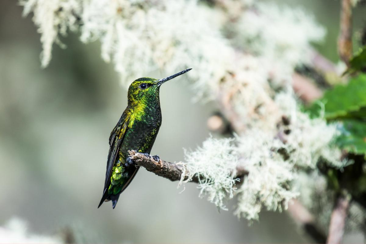 Esta es una hermosa especie de colibrí, propia de la sierra ecuatoriana y otras áreas andinas. Mide apenas unos 10 cm. Es generalmente verde brillante, con el pico negro, con algunas diferencias entre machos y hembras, ya que estas últimas tienen ciertas manchas blancas en la parte inferior del cuerpo.