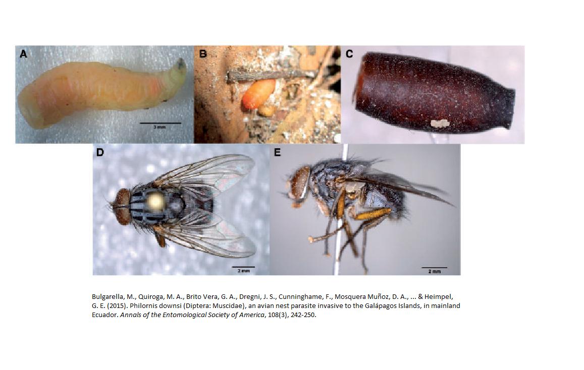 Uno de los animales invertebrados de las islas Galápagos es la mosca invasora (Philornis downsi). Se trata de una especie oriunda de Trinidad y Brasil, e introducida en las islas, donde se ha convertido en una auténtica plaga, poniendo en riesgo las especies endémicas. Esta mosca es capaz de parasitar distintas especies de aves, incluidos los pinzones, y causar la muerte de sus crías. Además, se alimenta de fruta y néctar, aunque las larvas necesitan la sangre de las aves que parasitan para desarrollarse.