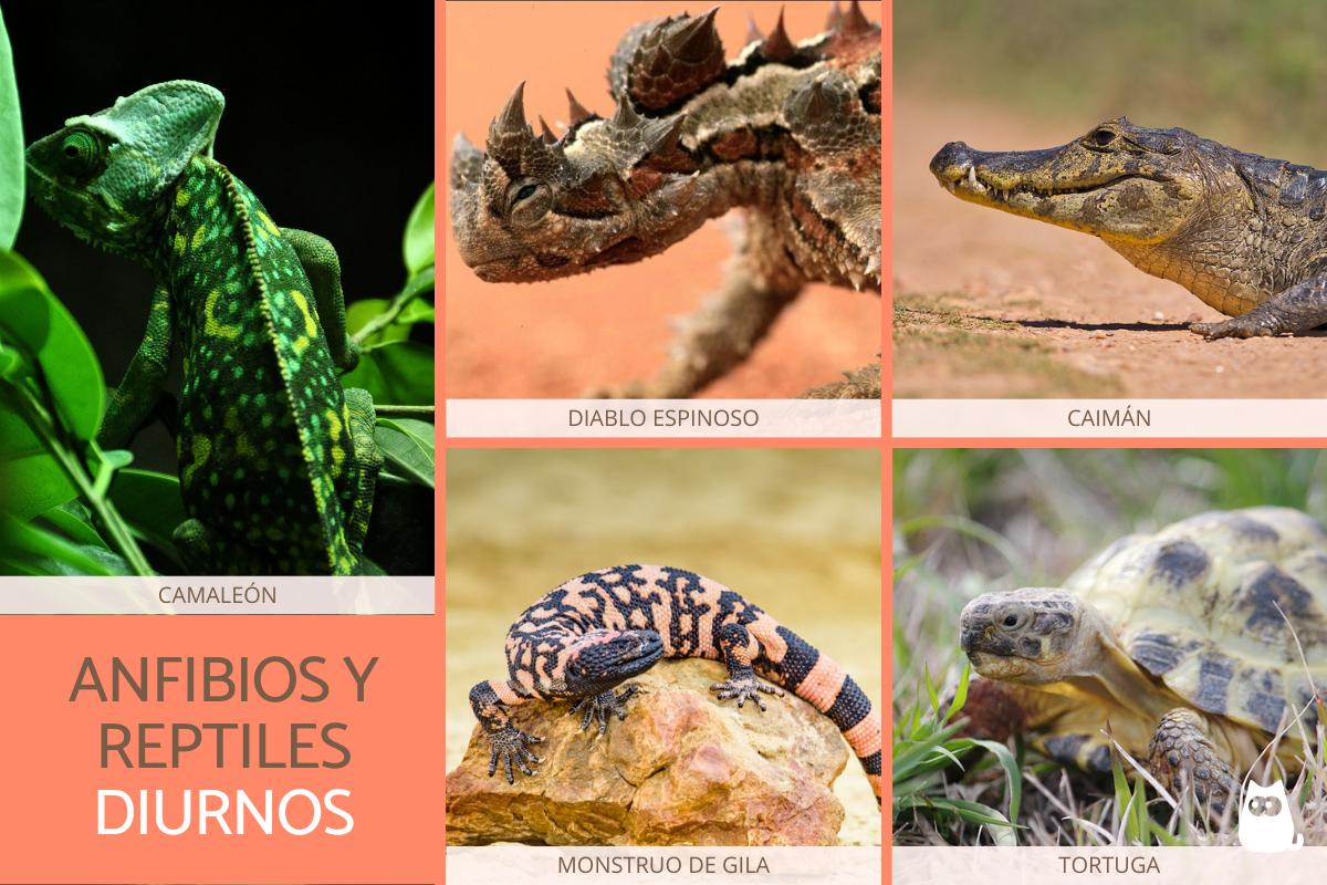 Entre los animales de hábitos diurnos, se encuentran varios reptiles y anfibios, como: