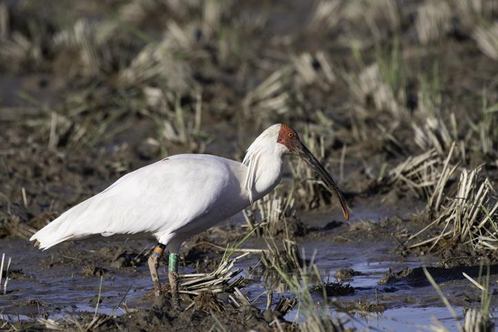 El ibis crestado pertenece a la familia Threskiornithidae y se distribuye por China, Japón, Corea y Rusia. Es habitante de bosques a los pies de las montañas donde existe una transición con la llanura y donde hay campos de arroz de los que esta ave se alimenta. Se trata de una especie muy llamativa, posee un pico largo y curvado hacia abajo, el plumaje blanco y, lo más peculiar, una cara desnuda (sin plumas) y de color rojo. Es típico observar a esta especie junto con otras aves acuáticas, como garzas, ya que de esta manera pasa desapercibida ante los depredadores.