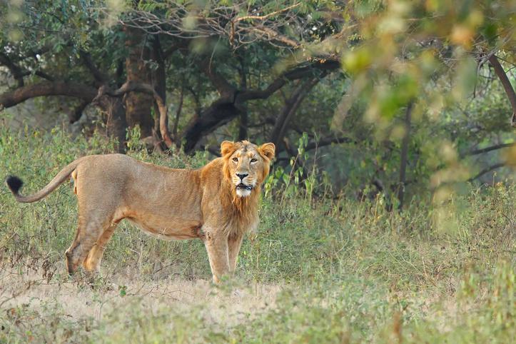 Actualmente, el león asiático está catalogado como animal en peligro de extinción en Asia debido a que la caza de estos animales por parte de los humanos ha hecho que su situación sea muy sensible, ya que los leones se acercan cada vez más a zonas de cultivos que están pobladas por humanos. Si bien su caza está prohibida y penada por ley, las autoridades de la región plantean el traslado de individuos a otras áreas protegidas de la India.