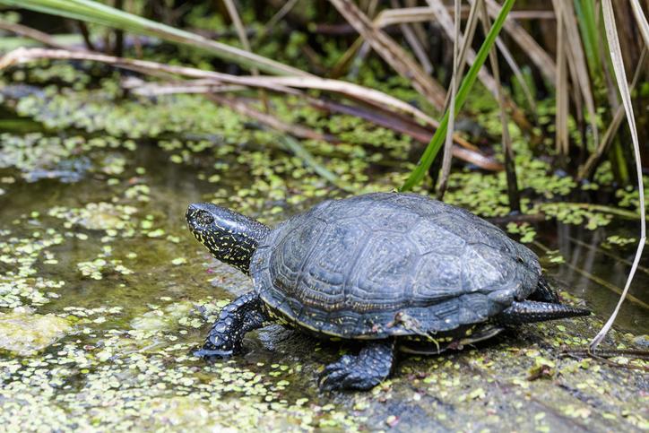 Esta tortuga pertenece a la familia Emydidae y se encuentra distribuida por casi toda Europa, llegando hasta el norte de África. Comúnmente, habita todo tipo de cuerpos de agua, aunque prefiere aguas poco profundas y con abundante vegetación, ya que le proporciona refugio y protección. Es una especie bastante pequeña, que de media suele alcanzar los 20 cm de largo, sin embargo, hay individuos que superan los 30 cm en algunas regiones. Su caparazón es de tonos verdosos y marrones, con manchas radiales amarillas, siendo este diseño muy variado. Posee un crecimiento muy lento, llegando a alcanzar la madurez sexual cerca de los 20 años, en el caso de las hembras.