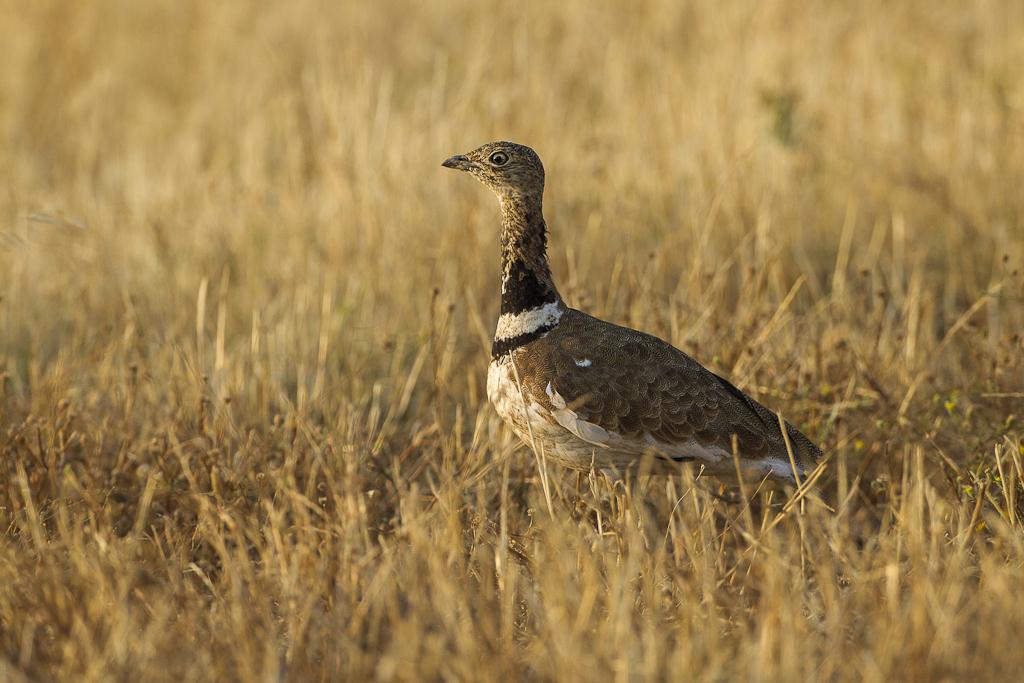 Esta ave pertenece a la familia Otidae y su distribución abarca la región oeste del paleártico, donde habita áreas de estepa, pastizales y áreas agrícolas de plantaciones de cereales. Es un ave gregaria de aspecto esbelto y con patas largas, similar a otras avutardas. Mide aproximadamente 45 cm de longitud. Su plumaje es de tonos castaños a dorados, típico de especies crípticas, y durante la época reproductiva el macho posee plumas negras con detalles blancos en el cuello.