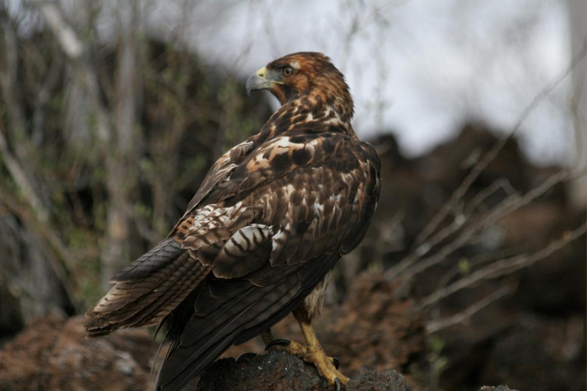 Esta es una especie de ave rapaz, presente solo en algunas islas del archipiélago de Galápagos, ya que se ha extinguido de ciertas de estas formaciones insulares. Puede medir entre 45 a 60 cm y pesar alrededor de 1 kg, aunque este rasgo varía de una isla a otra, por lo que pueden superar este valor. La coloración es parda, grisácea y algo de negro. Está clasificado como vulnerable.