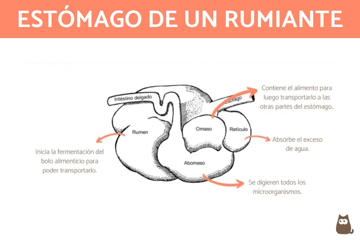 - Poligástricos: conocidos también como rumiantes, su estómago está dividido en varias cámaras o partes que se conocen como rumen, retículo, omaso y abomaso. También poseen bacterias anaeróbicas y protozoos que llevan a cabo la fermentación en este complejo sistema digestivo.