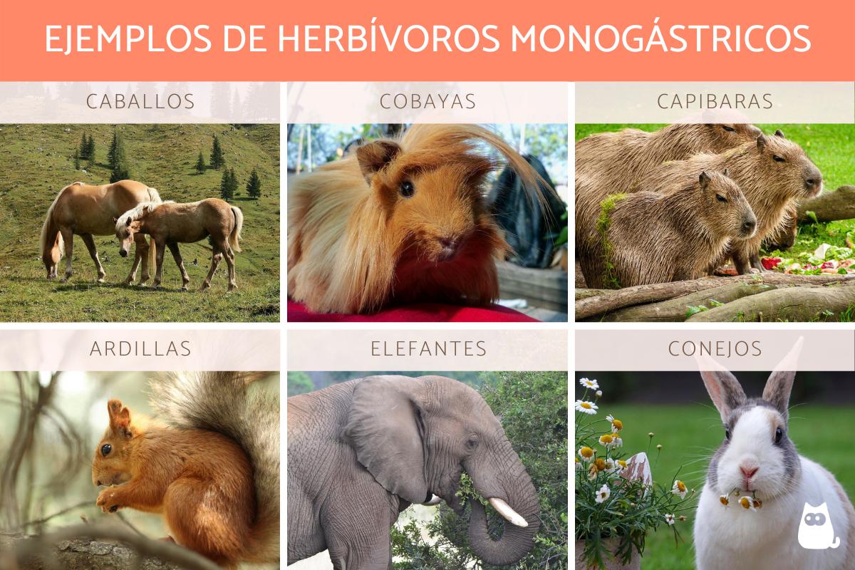 Los roedores y los équidos no son los únicos animales herbívoros que cuentan con un estómago sin cámaras, otros animales de mayor o menor tamaño también forman parte de este grupo de monogástricos, siendo los siguientes los más representativos: