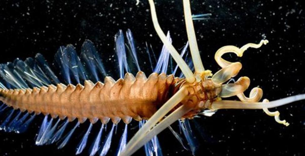 A una profundidad cercana a los 3.000 metros, en el Mar de Célebes se descubrió esta extraña especie de animal desconocido por la ciencia. Su alimentación se basa en plancton y habita las regiones de Filipinas e Indonesia. Tiene 25 "patas" o remos a cada lado de su largo cuerpo, que mide unos 9 cm. Además, también cuenta con tentáculos en su cabeza, lo que le brinda un aspecto similar al de un calamar.