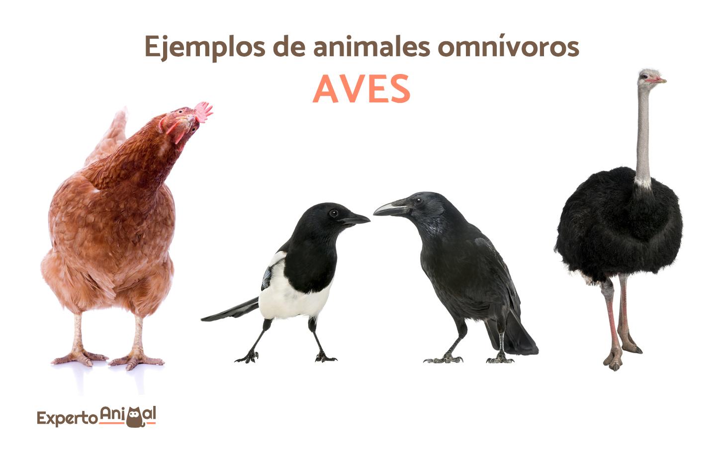 Las aves son animales que carecen de dientes, por lo que sus sistema digestivo está completamente adaptado para poder digerir alimentos prácticamente completos. Para ello, su esófago presenta una dilatación denominada buche que permite el almacenamiento de la comida antes de ser digerida. Por otro lado, cuentan con la llamada molleja, perteneciente al estómago, que se encarga de triturar el alimento con ayuda de su fuerte musculatura y las pequeñas piedras (gastrolitos) que las mismas aves ingieren con este objetivo. De esta forma, encontramos también aves carnívoras, aves frugívoras, granívoras y aves omnívoras, como los ejemplos de animales omnívoros de la lista que mostramos a continuación:
