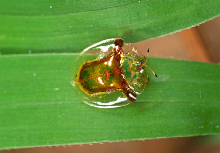 Otro de los animales que cambian de color es el escarabajo de la tortuga (Charidotella egregia). Se trata de un coleóptero cuyas alas reflejan un llamativo color dorado metálico. Sin embargo, frente a situaciones de estrés, su cuerpo transporta los fluidos hacia las alas y estas se tornan de un intenso color rojo.