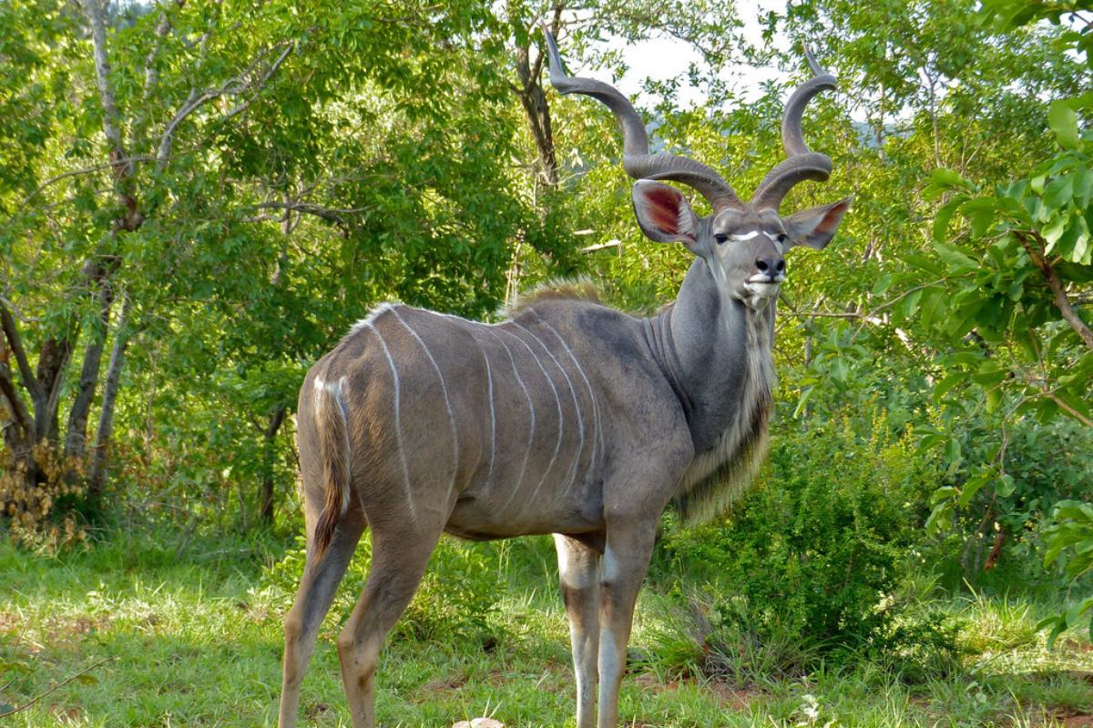 También conocido gran kudú o kudú mayor (Tragelaphus strepsiceros), se trata de un mamífero que vive en las sabanas llenas de bosques en África. Tiene un gran tamaño, al tratarse de un antílope africano, y cabe destacar que existe un evidente dimorfismo sexual entre las hembras kudú y los machos, ya que ellos tienen una cornamenta curvada en forma de V.