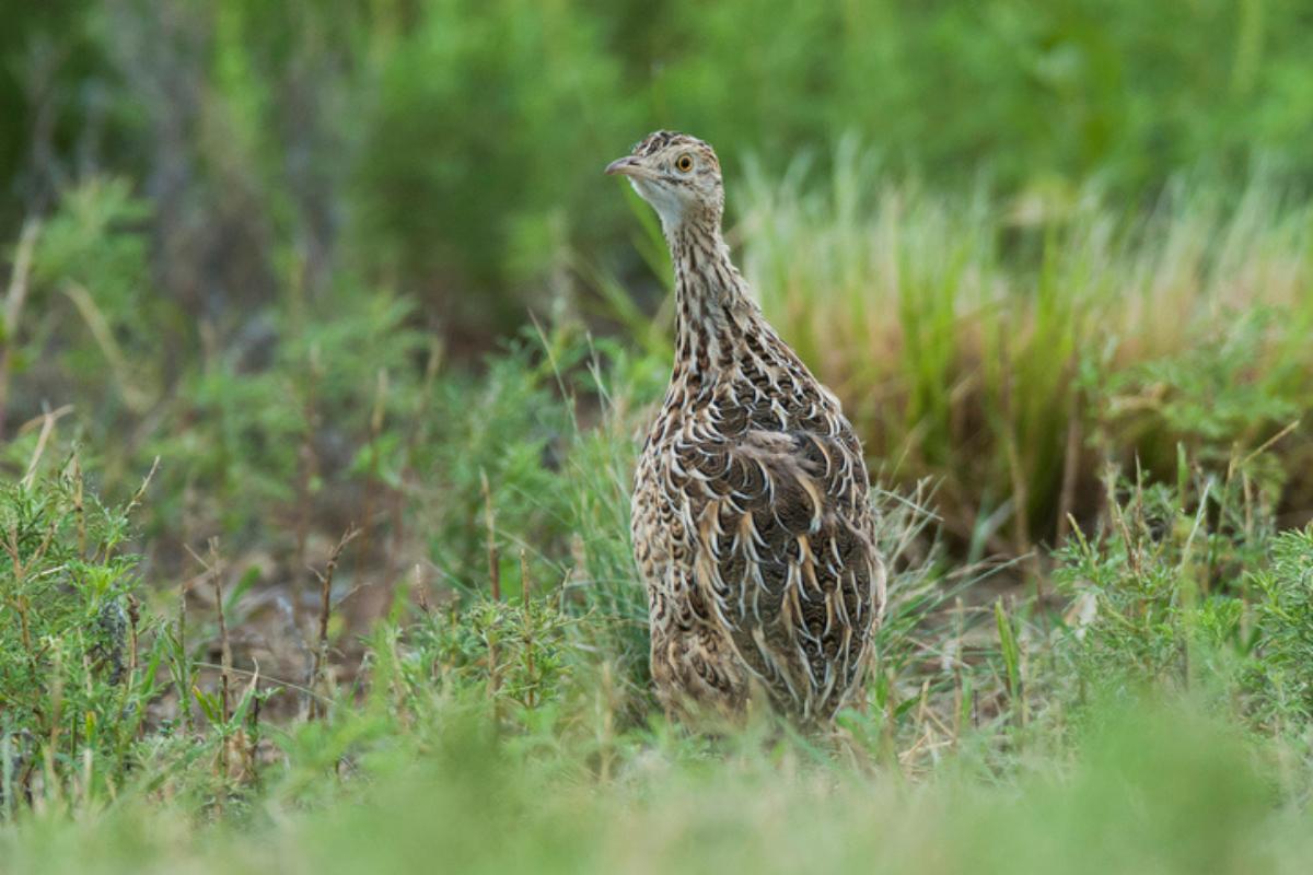 Este ave con I es fácil de identificar debido a su plumaje marrón con rayas verdosas. Además, posee un grueso pico gris y la parte inferior de su cuerpo es blanca.