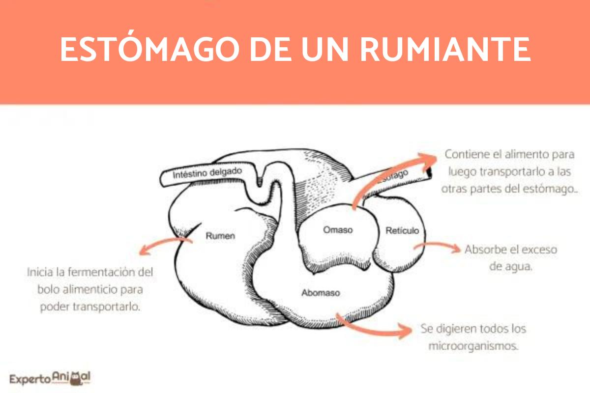 - Su estómago está dividido en cuatro cámaras o partes: rumen, retículo, omaso y abomaso, siendo este último el estómago verdadero.