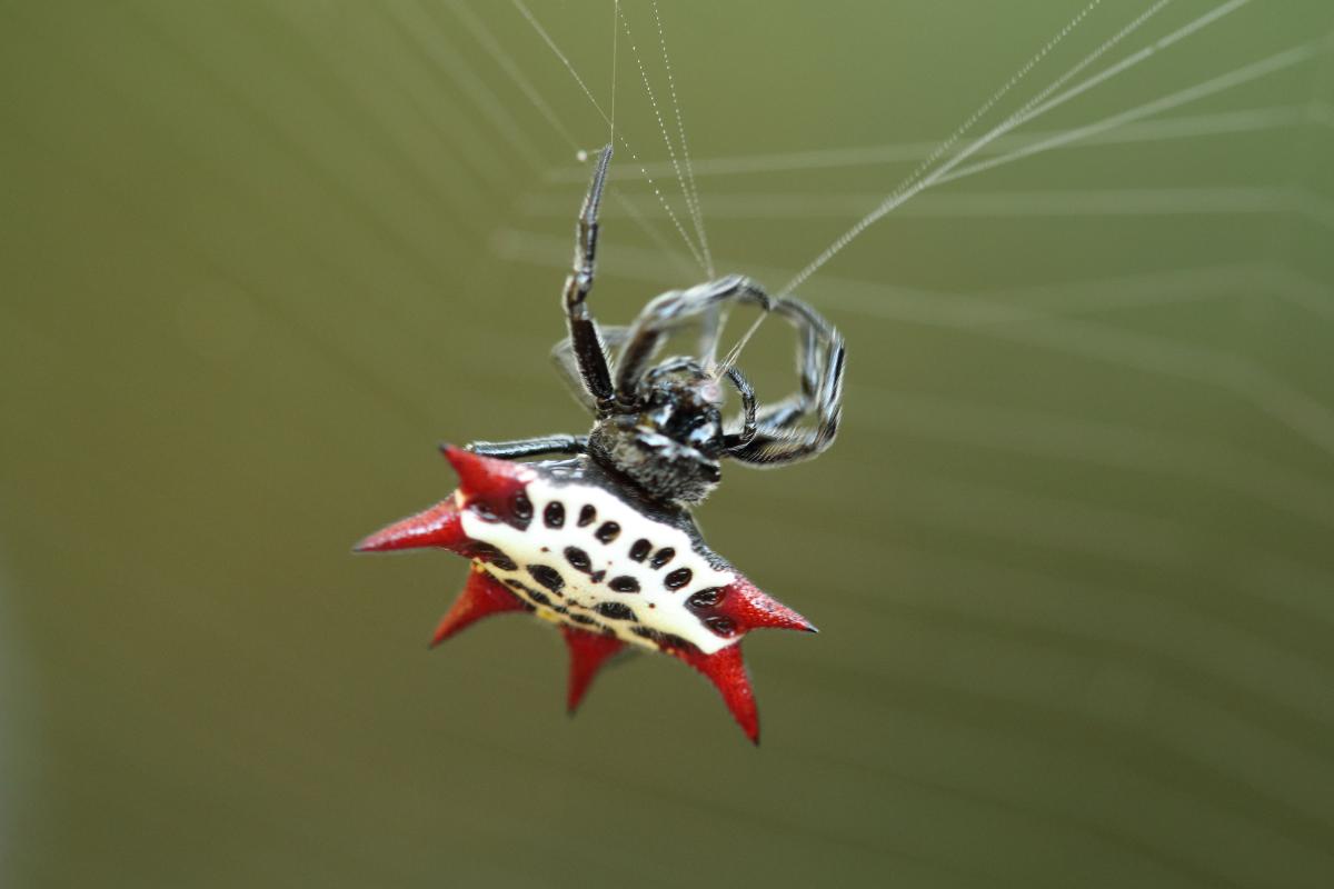 Gasteracantha cancriformis también es conocida como araña cangrejo o joya. Originaria de América Central y del Sur, esta especie es famosa por su forma inusual y sus coloridos patrones. Tiene un cuerpo compacto y redondeado que recuerda a la forma de un cangrejo, con espinas o proyecciones que sobresalen de su abdomen, dándole una apariencia algo amenazante. Su tamaño es relativamente pequeño, con un diámetro del abdomen que puede llegar a unos 8-10 mm. Su coloración varía, pero a menudo incluye combinaciones de blanco, amarillo, rojo y negro, lo que la hace muy llamativa.