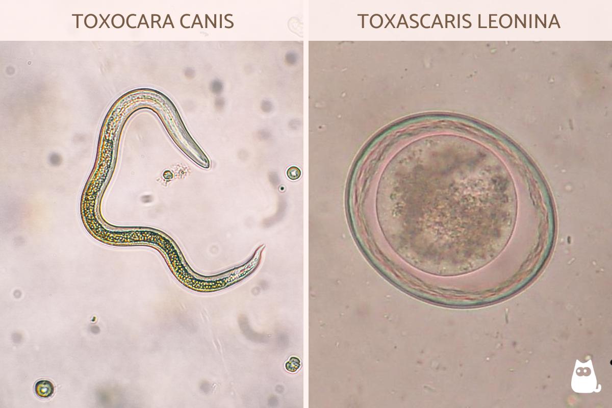 La realización de un análisis de heces permitirá detectar la presencia de huevos de ascáridos e identificar la especie concreta que ocasiona la infección. Los huevos de Toxocara son esféricos, oscuros y tienen una cubierta gruesa que suele presentar pequeñas hendiduras. Sin embargo, los huevos de Toxascaris son ligeramente ovoides, tienen una coloración más clara y presentan una cubierta lisa con una especie de trenzado en su cara interna.