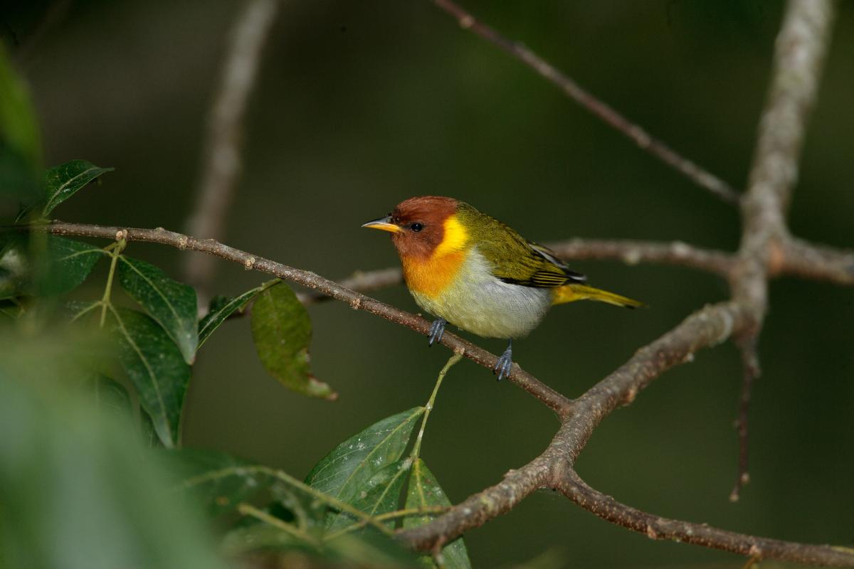 El escribano de pecho naranja es una pequeña y bonita ave nativa de México. Se desarrolla en bosques y matorrales secos, ya sean tropicales o subtropicales, donde tiene una amplia distribución. Mide unos 12,5 cm, con una corona verde, la nuca y la parte superior del cuerpo azul turquesa, con algo de verde, y toda la parte inferior de un amarillo intenso. Se alimenta de frutas, semillas e invertebrados. Se clasifica en la categoría de "menor preocupación".