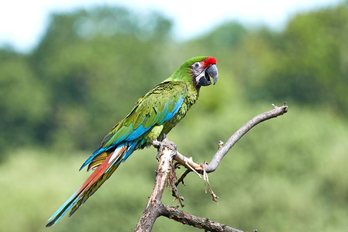 También conocido como guacamayo militar, es una de las especies más grandes de guacamayos, con una longitud que puede superar los 80 centímetros. Presenta un plumaje brillante y colorido que incluye tonos de verde, azul y rojo. Su cara es desnuda y tiene un característico parche rojo en la frente.