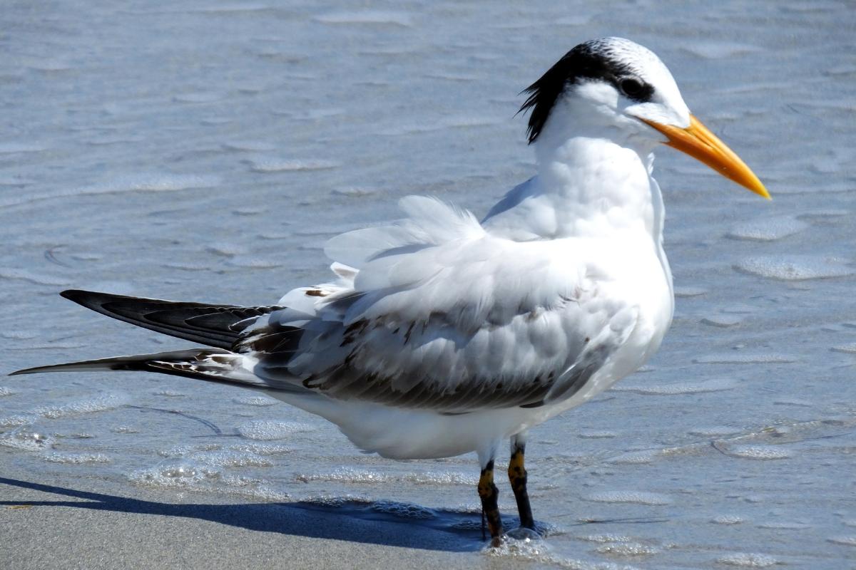 El gaviotín real es una elegante ave marina que se encuentra en las regiones costeras tropicales y subtropicales. Es conocido por su distintiva cresta negra en la cabeza y su plumaje blanco con alas negras. Su pico es largo y delgado, adaptado para capturar peces y otros pequeños organismos marinos. Es un cazador diurno que se alimenta principalmente de peces pequeños y crustáceos. Realiza vuelos rápidos y precisos para capturar a su presa, y a menudo se le observa en grupos realizando acrobacias aéreas mientras buscan comida.