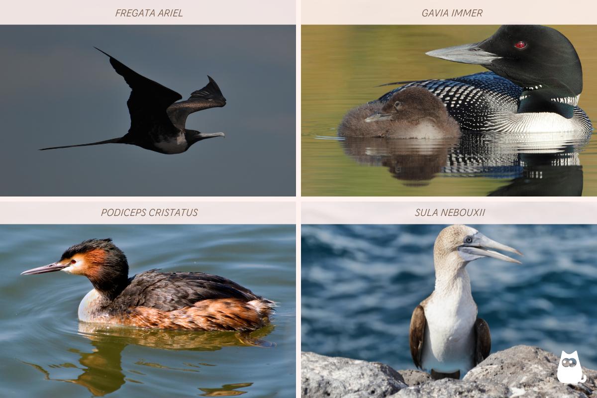 - Somormujos: como el somormujo lavanco (Podiceps cristatus).