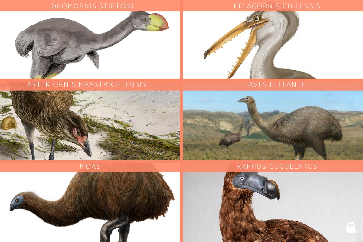 Ahora que ya sabemos que las aves prehistóricas actuales y extintas sí provienen de los dinosaurios, vamos a conocer un poco más de cerca algunas especies. Empezando por las últimas, dl grupo de aves prehistóricas extintas es muy amplio, conozcamos algunos ejemplos: